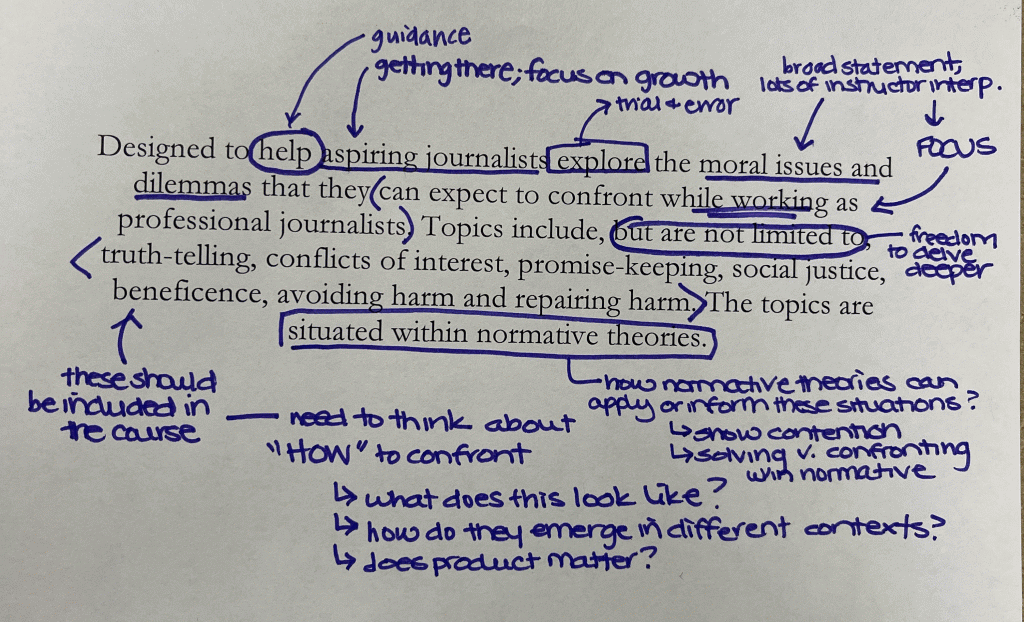 As you can see, when I work with the course description,I’m trying to understand its purpose, which should inform my design-centered practice. I consider the word choice and what that implies, as well as where I can create instructional experiences unique to my expertise. I also ask additional questions, which should hopefully help me get to some of the instructional decisions I would ultimately make.