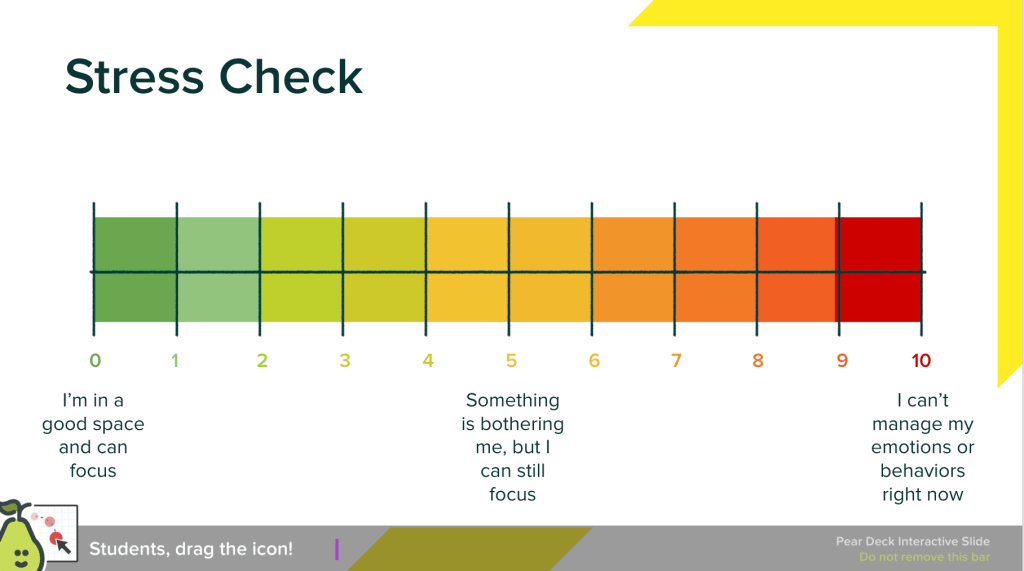 One of my favorite options is the “Stress Check” feature. I start my lessons using this feature to gauge where students are at. For this feature, students drag a line on a scale of 1-10. The responses are anonymous, but the instructor can see where all the lines fall collectively. I like to use this feature best to understand the feeling of the room ahead of class.